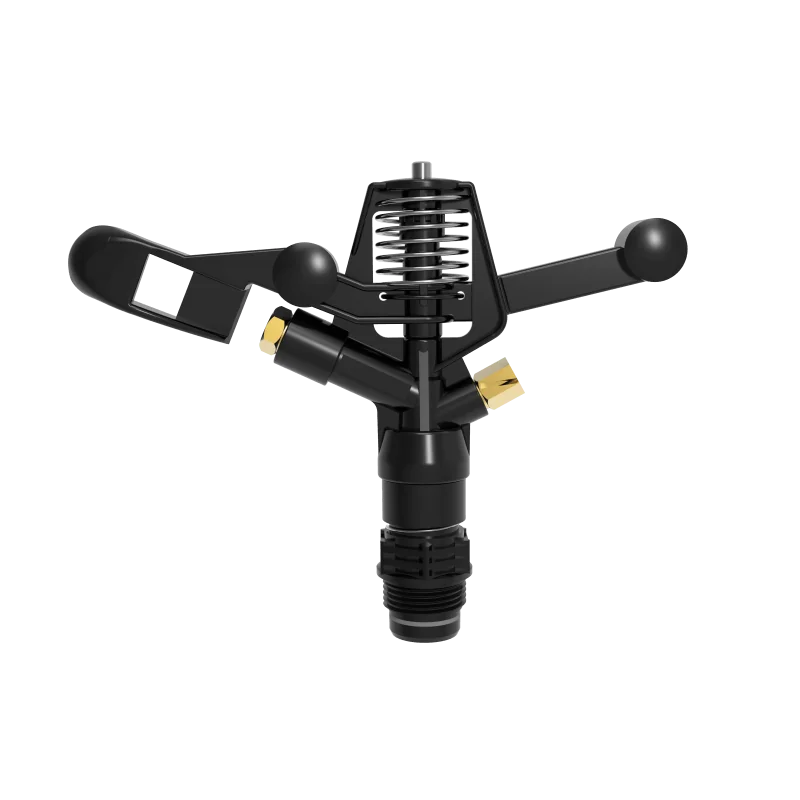 Aspersor de plástico apto para el riego circular, con doble boquilla de bronce. Bajos y medios caudales. Uso en jardines, riego de hortalizas y praderas, forrajes o cultivos en sistemas de riego fijos o móviles.