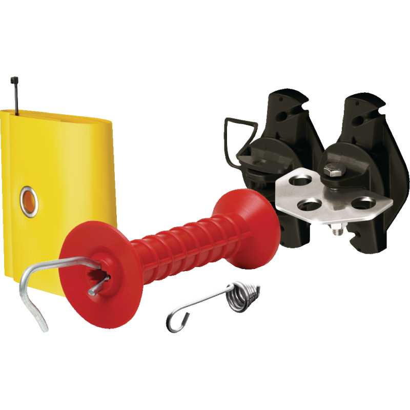 Componentes para armar una puerta Bungy. Incluye manija, aisladores, gancho y bandera. No incluye cordel. FABRICADO EN NUEVA ZELANDA
