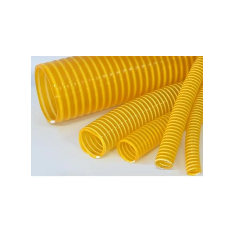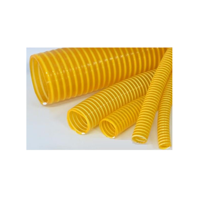 Manguera PVC espiralada, especial para agua y otros líquidos. Color amarillo / espiral blanco. Para uso liviano, presión de vacío 7 - 5 mca y presión de trabajo 7 a 2 bar, dependiendo del diámetro. Presión de ruptura 3 veces la presión de trabajo. Rollos de 50 m, 4”y 6” en 25m.