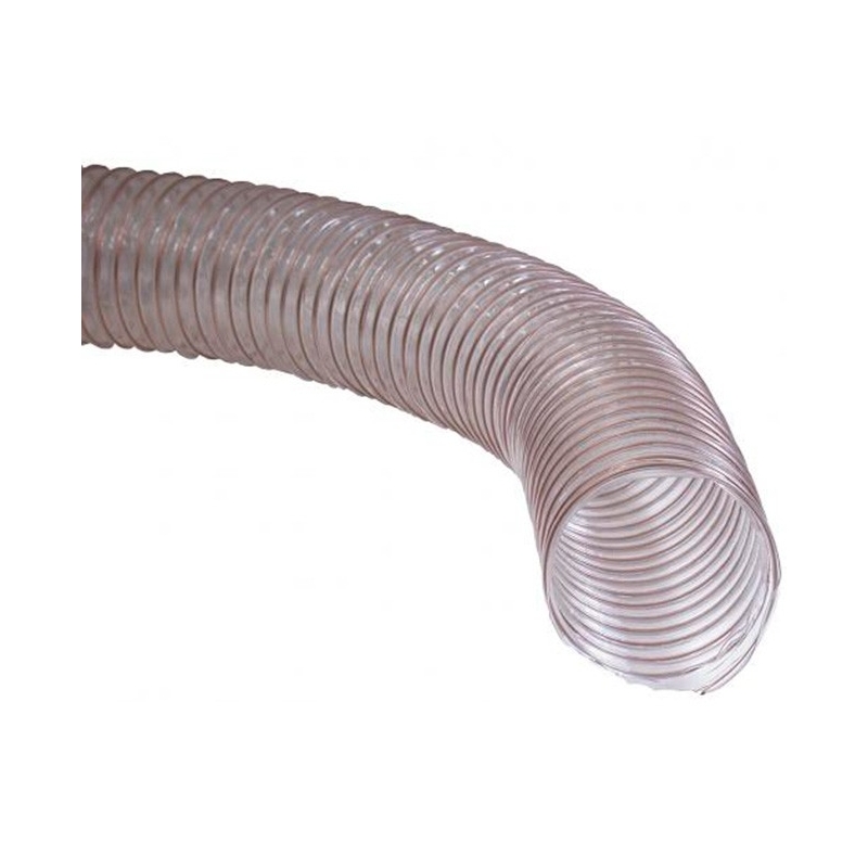 Manguera Poliuretano con espiral metálico, altamente resistente a la abrasión y extremadamente flexible. Especial para conducción de gases y sólidos abrasivos, aserrín, pellets, viruta, etc. Color translucido/ espiral metal.