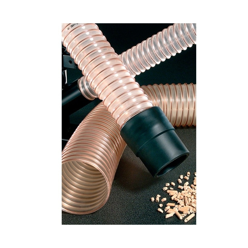 Manguera Poliuretano con espiral metálico, altamente resistente a la abrasión y extremadamente flexible.Especial para conducción de gases y sólidos abrasivos, aserrín, pellets, viruta, etc. Color translucido/ espiral cobre. Rollos de 30 m. Medidas 1"-12" / 25 a 300mm. NO EXPONER AL AGUA POR TIEMPO PROLONGADO. MerlettFABRICADO EN ITALIA.