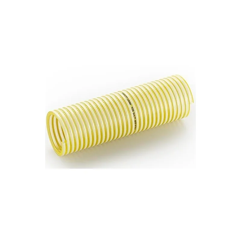 Manguera de PVC espiralada diseñada para impulsión y aspiración de agua, productos alimenticios y otros líquidos. Color: Amarillo con espiral blanco.Presión de trabajo 8 a 2 bar dependiendo del diámetro. Precio de ruptura 3 veces presión de trabajo. Rollos de 50m 3/4”a 3”, 25m 4” a 6” y 10m en 8”. MerlettFABRICADA EN ITALIA.