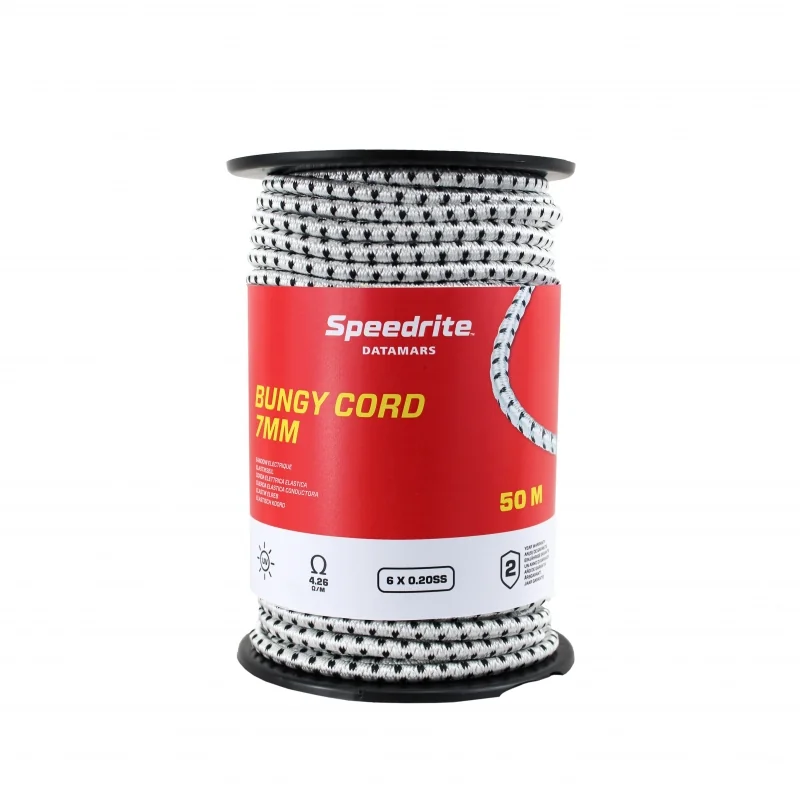 Cordel elástico. Cordón con núcleo de hebras de látex trenzado con envoltura resistente a los rayos UV para cerco eléctrico. Alta conductividad gracias a sus cuatro alambres de acero inoxidable. Largo contraído 50% del largo estirado.FABRICADO EN NUEVA ZELANDA