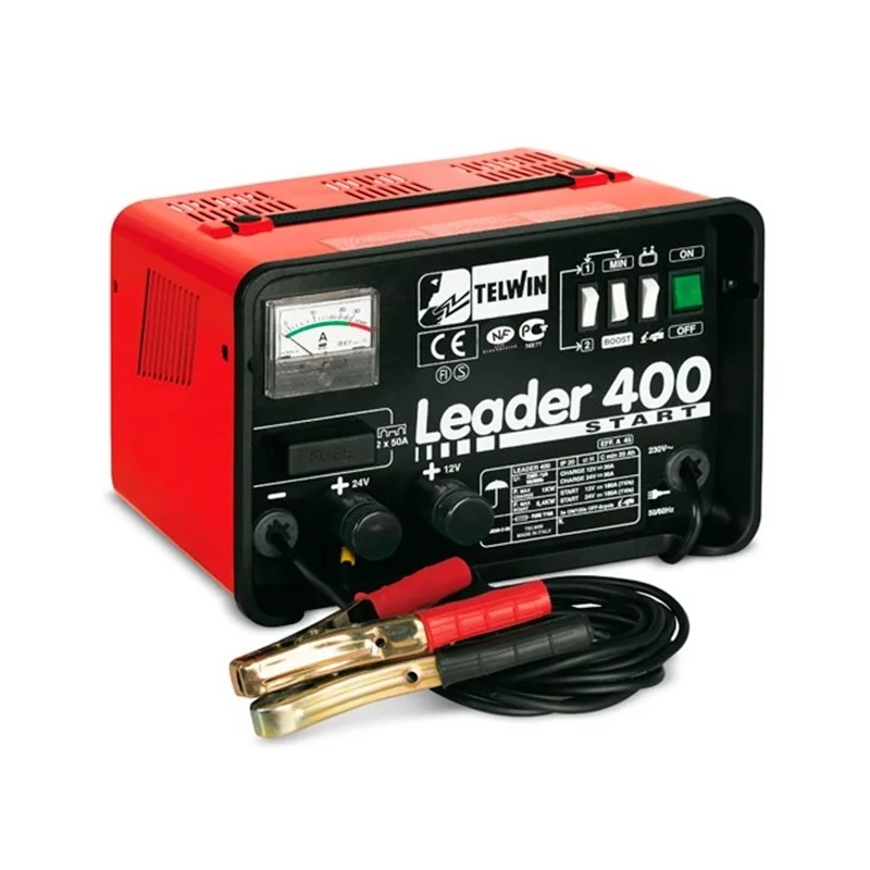 Cargador de batería y partidor, portátil, monofásico. Para cargas de baterías de electrolito libre (WET) con tensión de 12/24 V, arranque de cualquier motor a gasolina y diesel hasta 70 HP, protección termostática contra sobrecargas, contra polaridad inversa y cortocircuitos de salida, equipado con selector de carga normal, rápida (Boost). Carga máxima 45 A, partida 300 A, tamaño mínimo batería 20Ah.FABRICADO EN ITALIA.