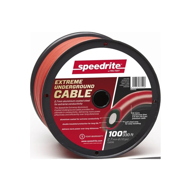 Alambre subterráneo recubierto en aluminio, 3 veces mas conductor que el alambre normal, triple aislación con protección UV para cerco eléctrico. Ideal para grandes longitudes o energizadores de gran tamaño. Puede ser enterrado directamente en el suelo. Muy duradero. Color rojo. Alambre galvanizado recubierto en aluminio, diámetro 2,7mm. Rollos de 100m y 500m.FABRICADO EN NUEVA ZELANDIA.