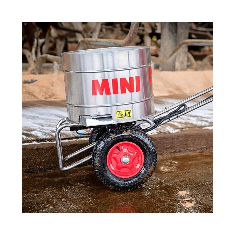 Dispensador de cal, funciona con motor electrico alimentado por bateria, capacidad de 95 litros, alcance entre 60 y 90 cm para un total de 160 cubiculos.