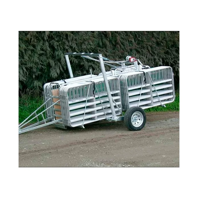 El corral móvil es fabricado en aluminio y paneles de plástico, incluye un carro de transporte de 3m de largo. Cuenta con una capacidad de hasta 750 ovejas.