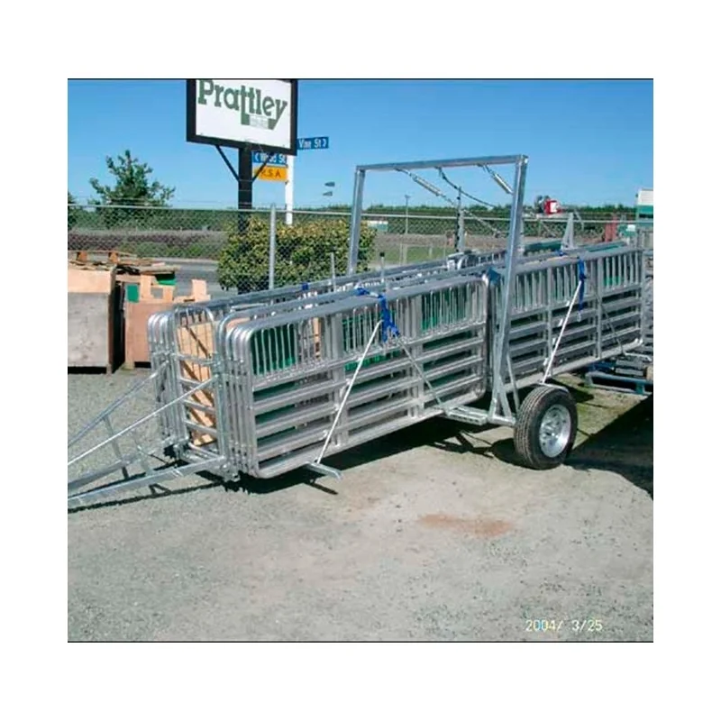 El corral móvil es fabricado en aluminio y paneles de plástico, incluye un carro de transporte de 3m de largo. Cuenta con una capacidad de hasta 2200 ovejas.