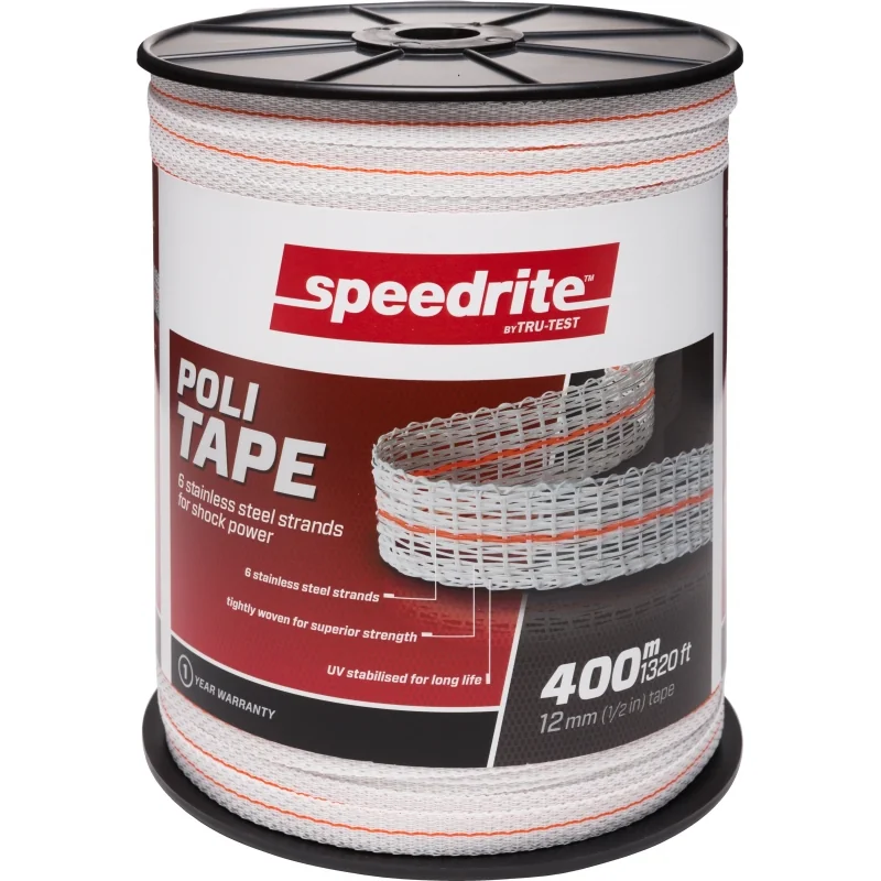 Cinta Eléctrica o Politape de 10mm de ancho con 5 conductores de acero inoxidable y polietileno estabilizado contra los rayos UV para cerco eléctrico. Color blanco, disponible en rollos de 200 y 400m. Resistividad eléctrica 7500 ?/km, no se recomienda para largos mayores a 400 metros.FABRICADO EN NUEVA ZELANDA