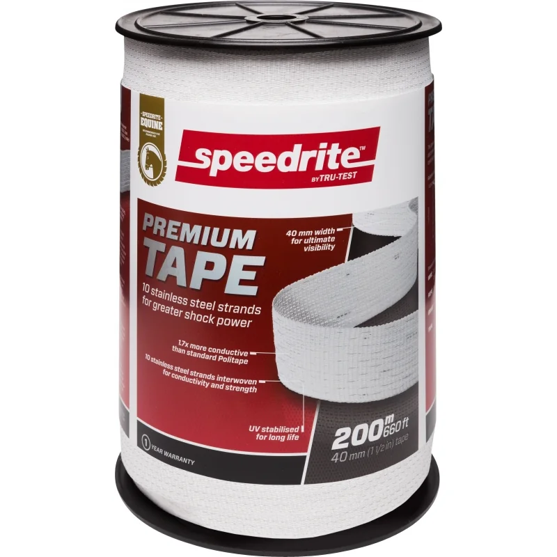 Cinta conductora altamente visible de 40 mm en color blanco, con 10 conductores de acero inoxidable cerco eléctrico. Rollo de 200 m.FABRICADO EN NUEVA ZELANDA