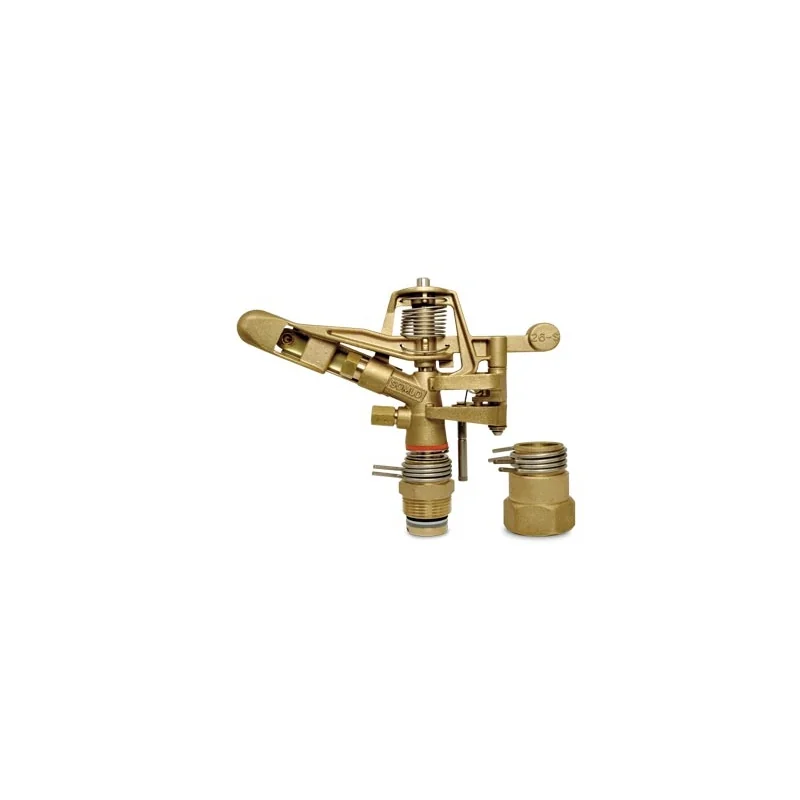Aspersor de bronce apto para el riego por sectores, con doble boquilla. Bajos y medios caudales. Uso en jardines, riego de hortalizas y praderas, forrajeras o cultivos en sistemas de riego fijos o móviles.