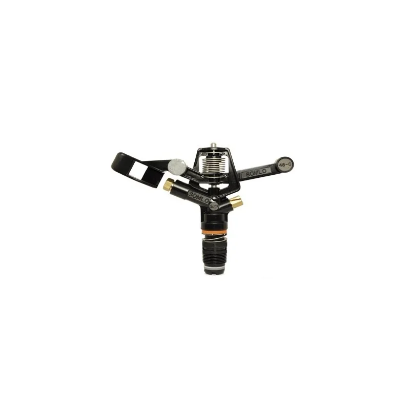 Aspersor de plástico apto para el riego circular, con doble boquilla. Bajos y medios caudales. Uso en jardines, riego de hortalizas y praderas, forrajeras o cultivos en sistemas de riego fijos o móviles.